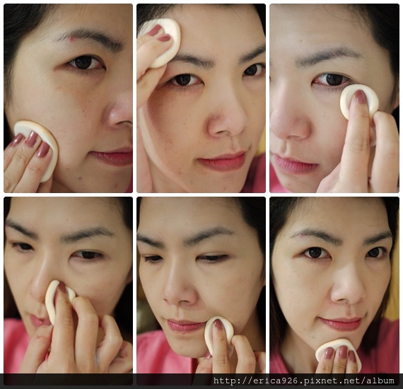 依平常上妝的步驟臉頰、額頭、眼週、鼻子、下巴均勻的塗抹上
