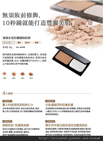 別小看這塊粉餅,它的礦物粉末除了讓肌膚無負擔外,因有良好的附著力讓遮瑕效果100分