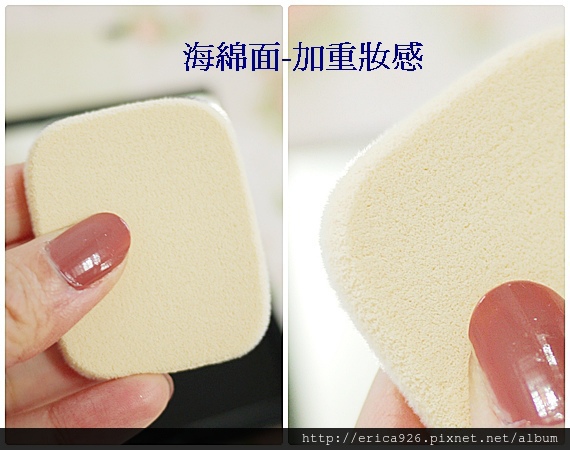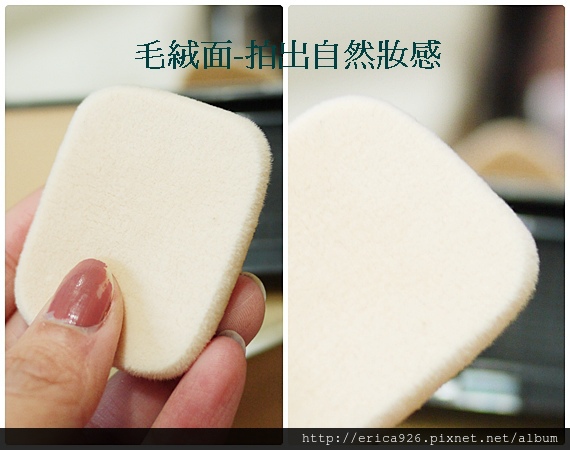 在早上上妝時我會使用海綿面使妝感一次到位~之後的補妝即使幅毛絨面
